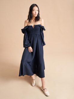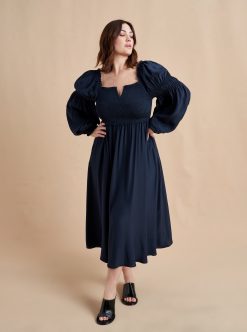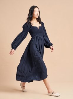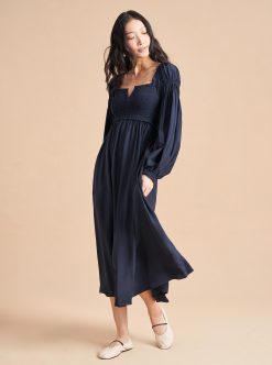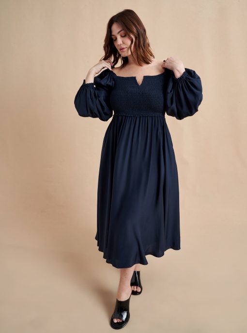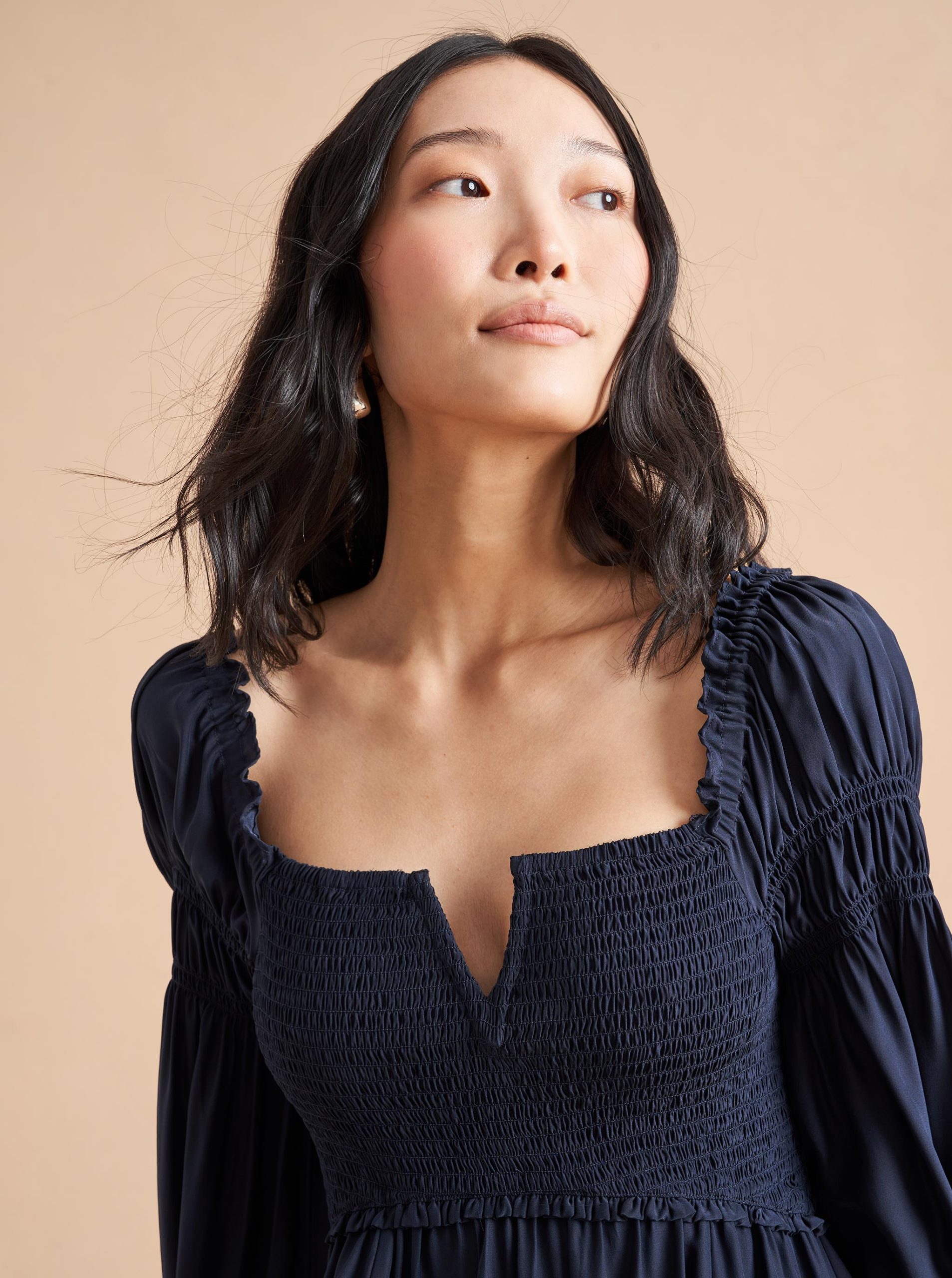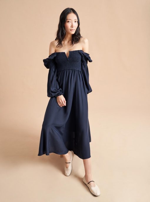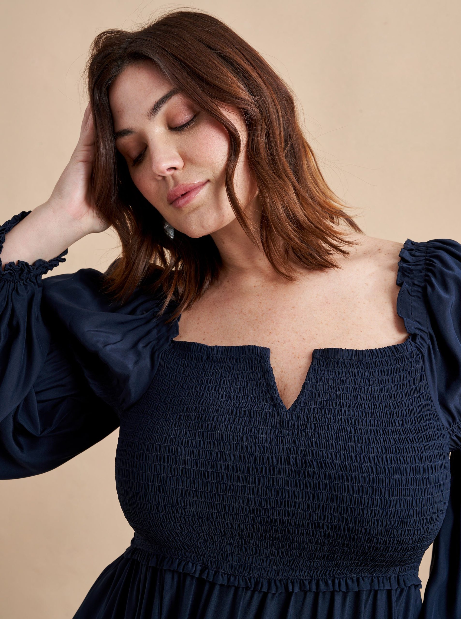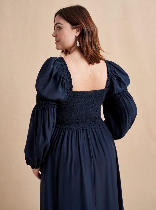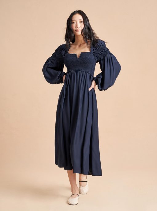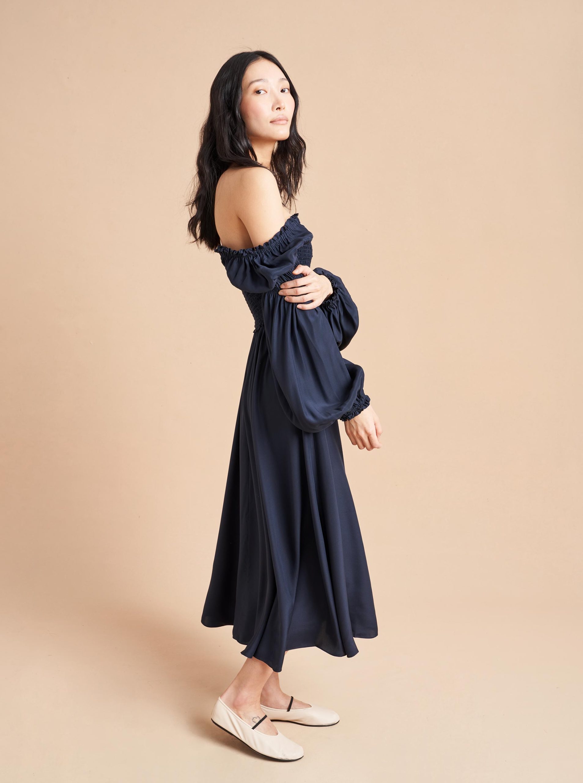 Named after La Bande member, Bettina Prentice, this romantic, airy, Pre-Raphaelite inspired dress in navy silk charmeuse is heaven-sent. Float away in its long balloon sleeves, smocked bodice for ease and the feminine open neckline.