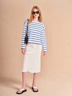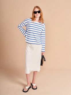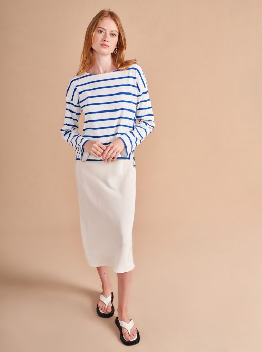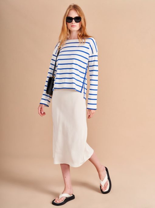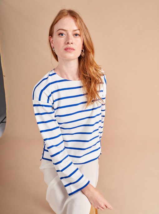 The epitome of quintessential Breton style, this long sleeve tee does it all in 100% super soft ivory cotton with cobalt stripes.