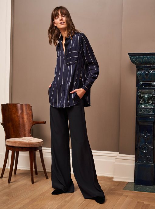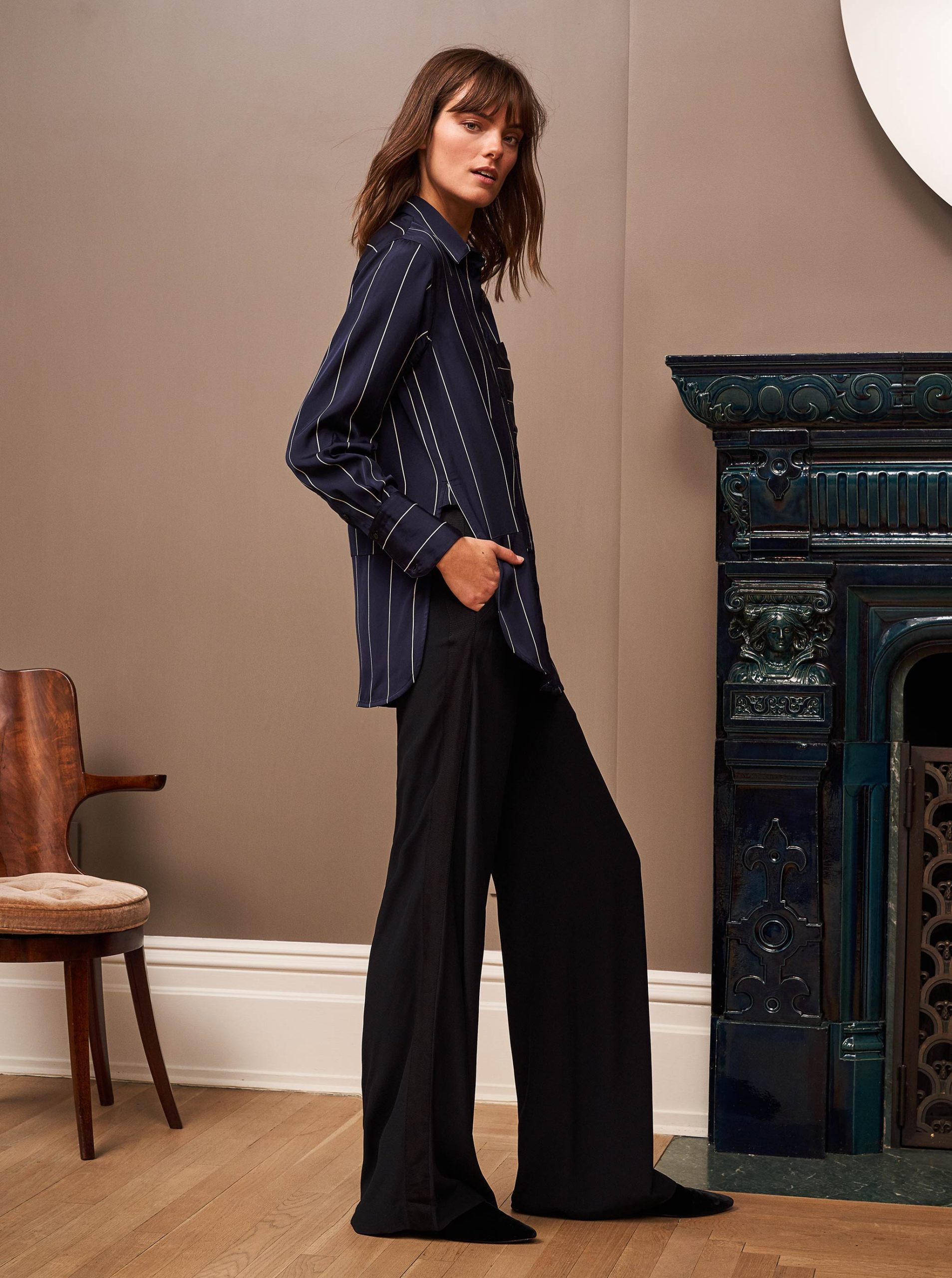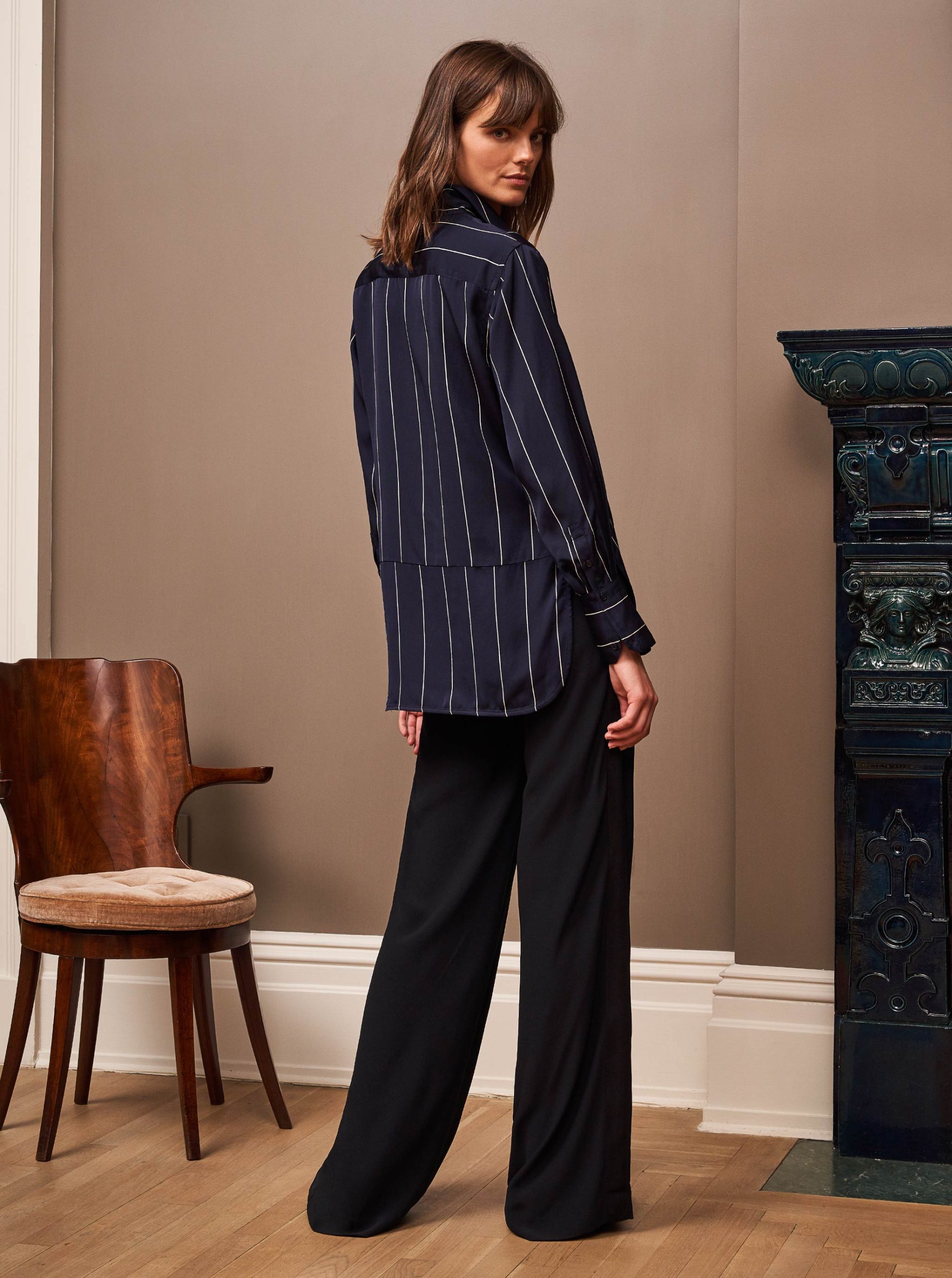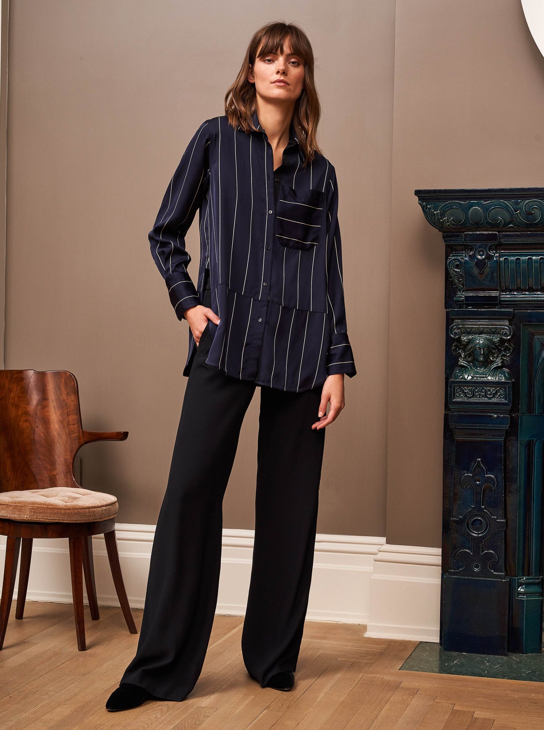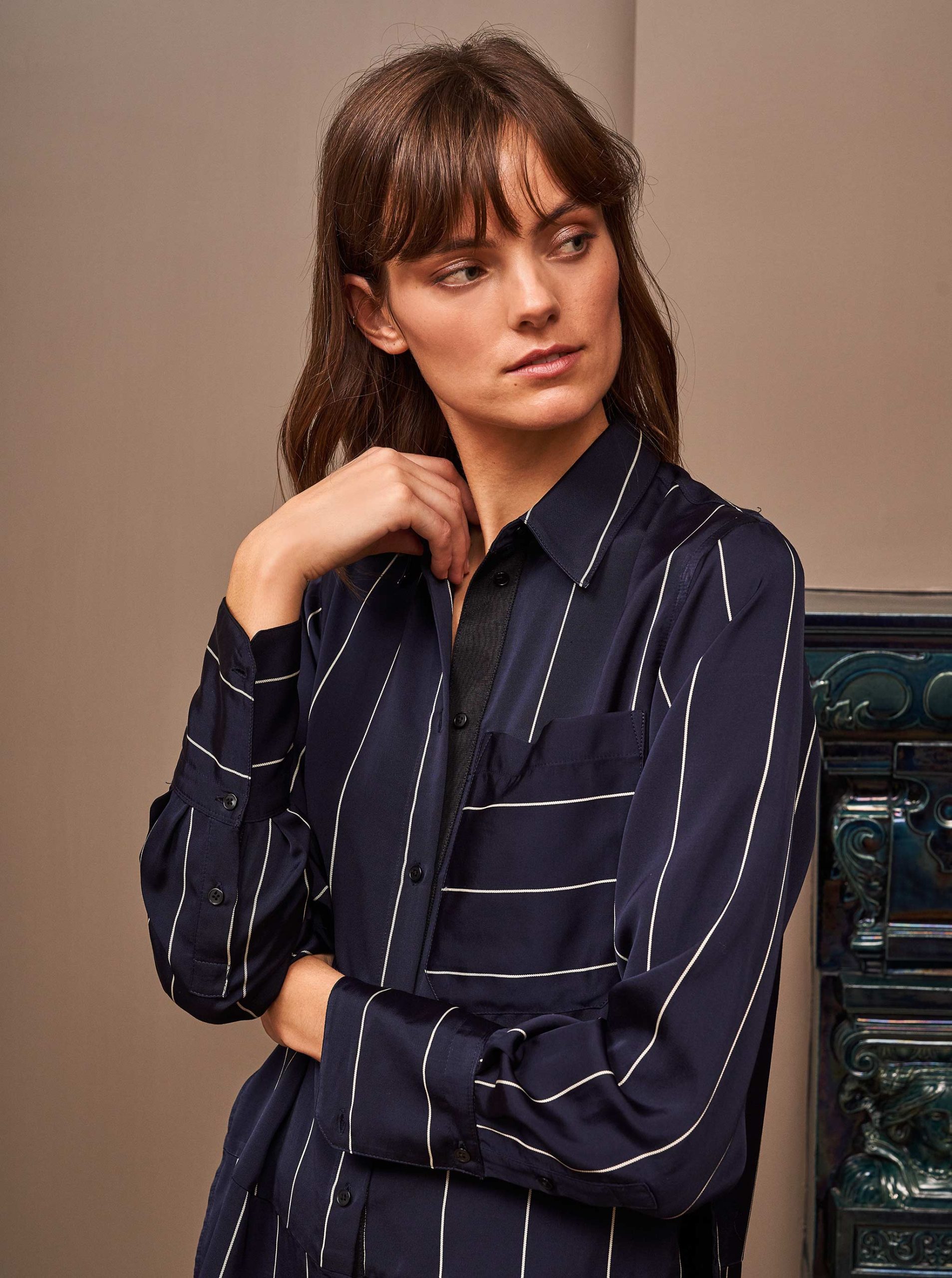 The pinstripe detail and shirt cuff sleeve make sure you are taken seriously without losing any femininity in our menswear inspired button down. Style it with any of our tailored pants for a power move and denim for the classic and timeless pairing.