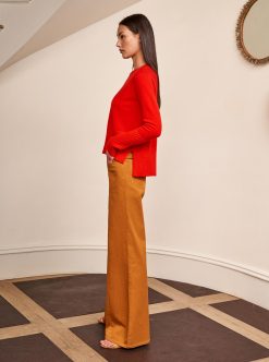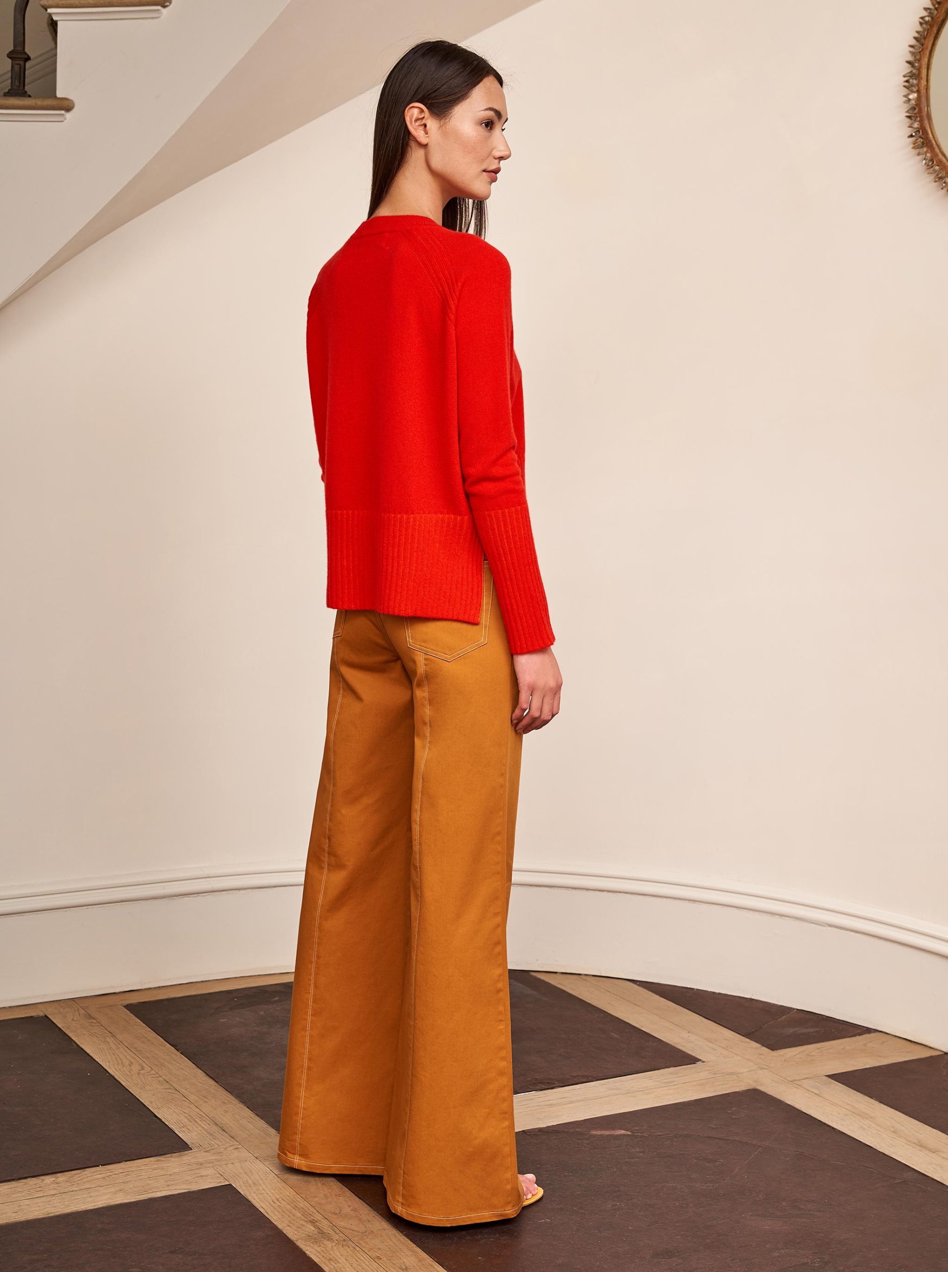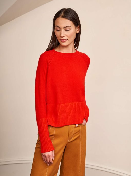 This oversized bright red sweater with side slits and asymmetrical hem will spice up any look.