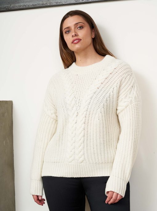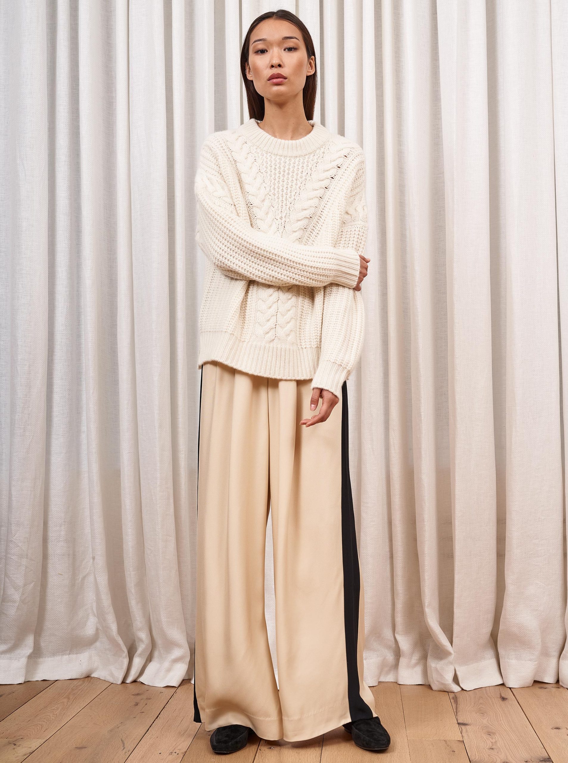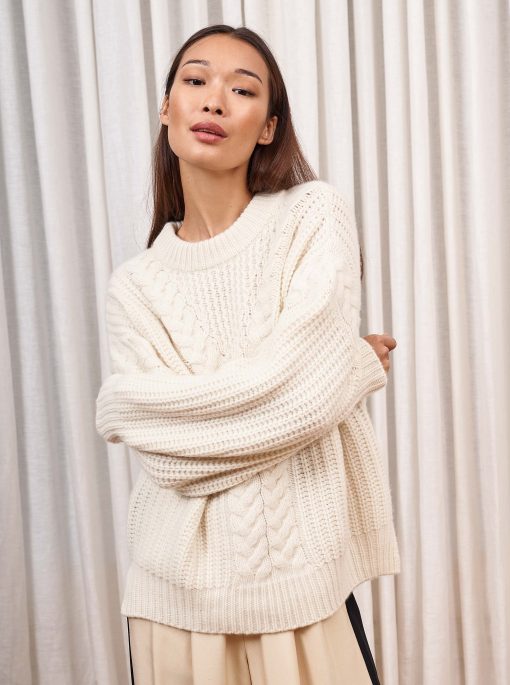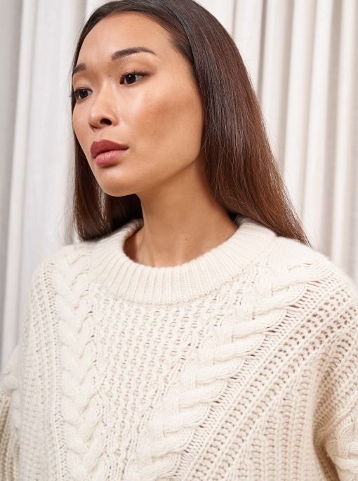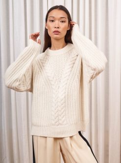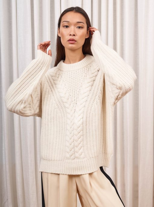 This feathery-soft, cable rib sweater in cream cashmere is ready for the cold, goes with anything and most importantly, keeps it chic.